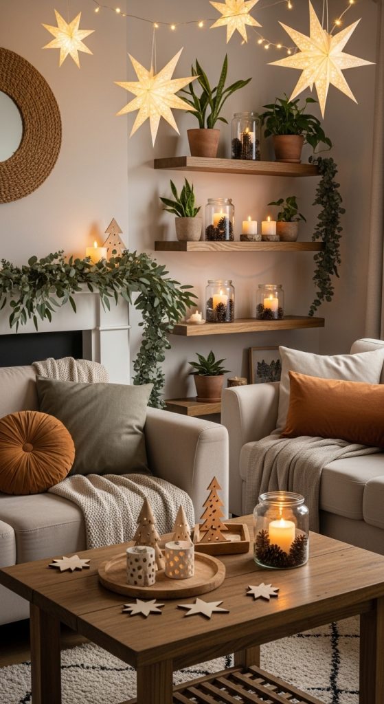 You can place a mirror or artwork above the mantel framed in natural wood or gold to reflect the light from candles or string lights. The combination of greenery, soft lighting, and gentle metallic touches enhances both elegance and warmth. This cozy setting invites family gatherings and provides the perfect spot for holiday photos.