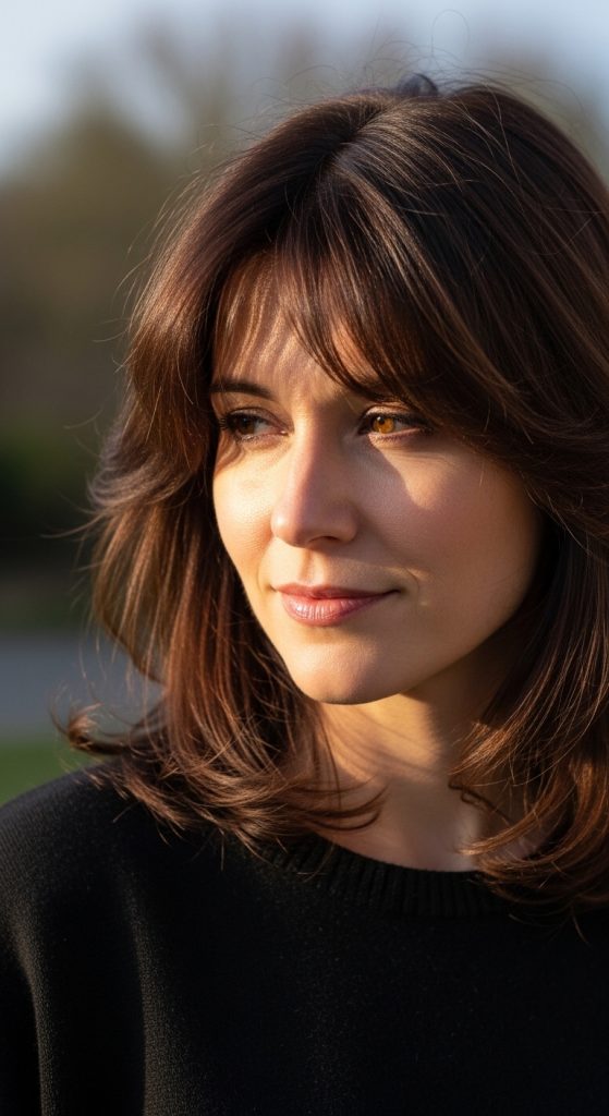 To achieve this look, ask your stylist for long bangs that gradually blend with the rest of your hair. Ideal length is around your cheekbones or jawline. At home, use a round brush and a hairdryer to style the bangs, brushing them diagonally across your forehead. Light styling cream or serum helps maintain smoothness without weighing down the hair. Side-swept bangs work with straight, wavy, or slightly curly hair and are versatile for both casual and formal occasions. This style is easy to maintain and can be refreshed quickly with a blow-dry or a simple combing.