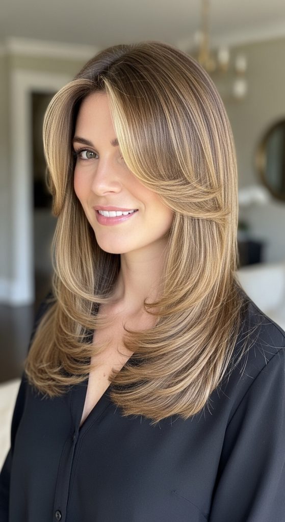 Ask your stylist for long layers starting near the cheekbones. The middle part should align with your nose bridge for proportional balance. Styling involves blow-drying with a round brush to shape the layers inward. You can also add gentle curls to add volume at the sides, minimizing forehead width. This hairstyle works with straight, wavy, or curly hair and is elegant for all occasions. Using a heat protectant before styling prevents damage and maintains shine.