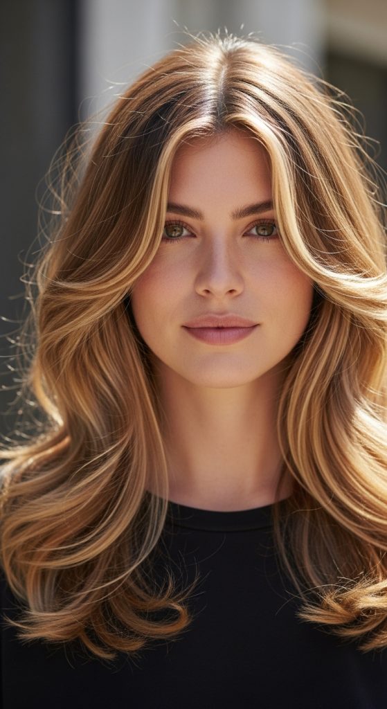 To achieve layered waves, request long layers from your stylist. Use a curling wand to create loose waves starting a few inches from the roots. Apply a texturizing spray for added definition and body. Avoid very tight curls that can add volume at the top, making the forehead appear larger. Layered waves are versatile, working with medium to long hair, and they give a relaxed, feminine appearance. This hairstyle suits everyday wear, social events, and even formal occasions.