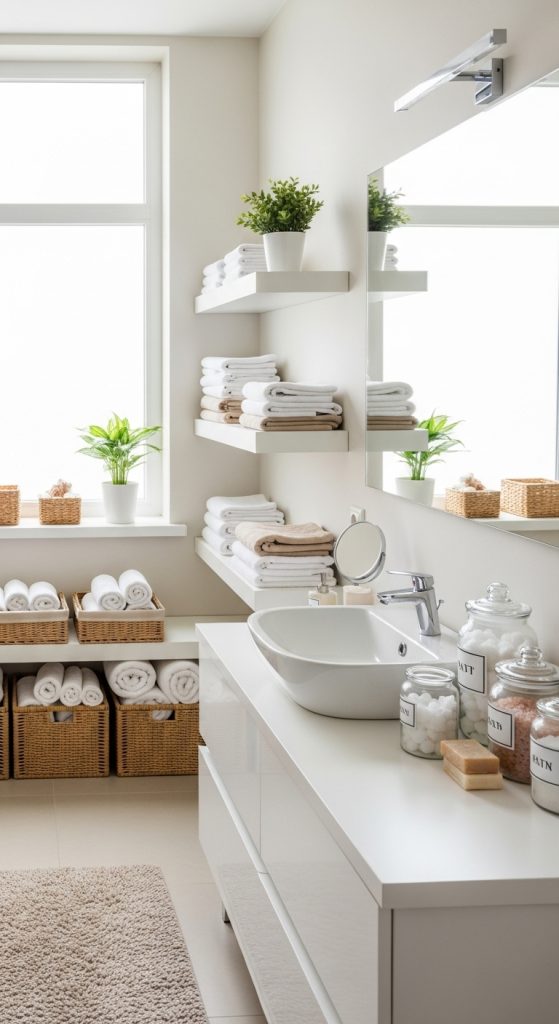 A well-organized bathroom improves hygiene and daily routines. Preparation materials include drawer organizers, baskets, wall-mounted shelves, and towel racks. Begin by discarding expired cosmetics and products. Group items into categories such as skincare, hygiene, and cleaning supplies. Use clear containers for visibility and label each for easy access. Install shelves or medicine cabinets to maximize vertical space. Store towels and linens in a designated closet, rolling them for space efficiency. Use bins for small items like hair accessories or travel-size toiletries. Maintain order by setting a monthly schedule for checking supplies and cleaning. This plan ensures your bathroom remains a refreshing and clutter-free environment that promotes relaxation and efficiency.