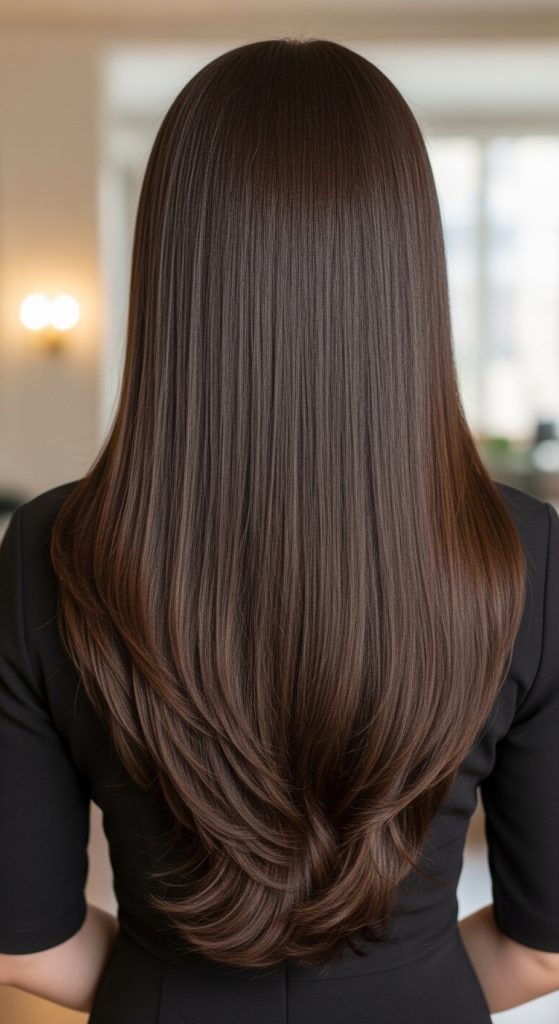A V cut keeps the front length long while the back forms a soft V shape. This style adds subtle interest without complicated layers. Straight hair shows the V shape clearly, giving a graceful finish.