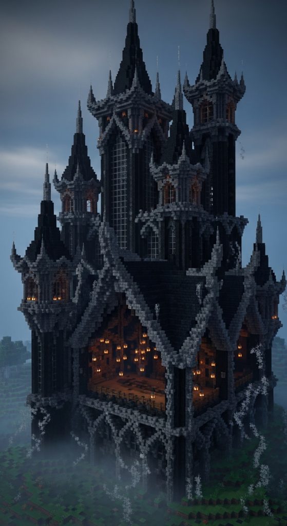 A gothic dark castle brings a mysterious and intimidating style to your Minecraft world. Use blackstone, obsidian, stone bricks, and dark wood for walls, towers, and floors. Start with a strong foundation and tall, spiked towers. Add pointed arches, large windows, and interior halls with chandeliers or lanterns to enhance the gothic theme. Courtyards can have fountains or statues made of dark stone.