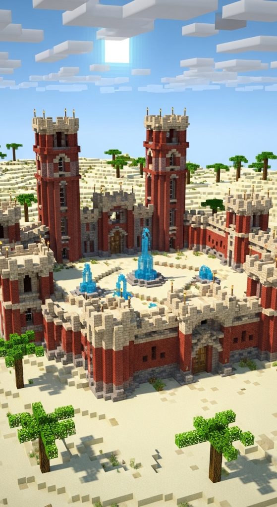 A desert castle offers a bright and sandy aesthetic, perfect for desert biomes. Sandstone, smooth sandstone, and red sandstone are excellent materials for walls, towers, and flooring. Begin by laying out the castle’s foundation with sandstone blocks. Include towers at each corner and decorate walls with arches and windows. A central courtyard with fountains or gardens adds charm and functionality.