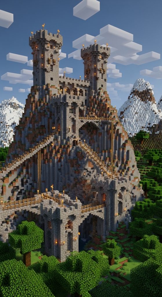 A mountain fortress is perfect for players who want a castle integrated into natural terrain. These castles are built directly into cliffs or mountains, giving them a unique and secure appearance. Start by finding a suitable mountain with flat surfaces for walls and towers. Use stone and cobblestone for the main structure, blending the castle into the natural rock. Dig tunnels and create interior rooms carved into the mountain for storage, living areas, or secret passages.