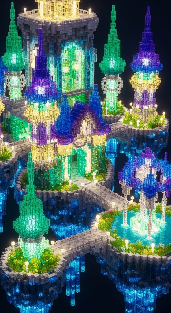 A fantasy crystal castle is a magical build made with colored glass, quartz, and glowstone. Begin by designing towers and walls with crystal-like shapes, using glass blocks in bright colors. Glowstone or sea lanterns add a shimmering effect. Include spires, bridges, and floating platforms for a mystical look. Courtyards can feature glowing pools or gardens with colored plants.