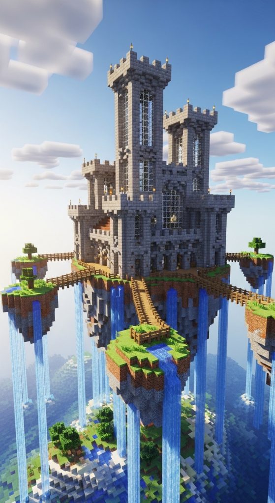 A floating sky castle is a creative build that hovers above the ground. To create one, choose a location high in the sky or use scaffolding to lift the structure. Use stone bricks, wood, and glass for walls, floors, and windows. Build towers, bridges, and terraces to enhance the feeling of height and grandeur. You can connect multiple floating islands with bridges or vines for a magical effect.