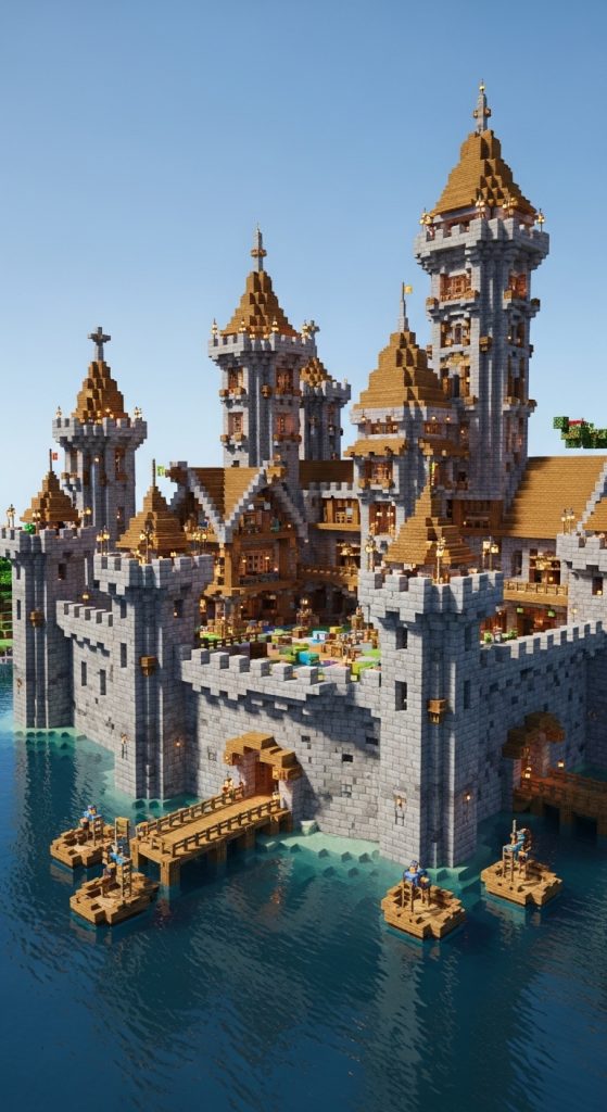 A water castle is built on or surrounded by water, creating natural protection and visual appeal. Start by finding a river, lake, or ocean biome. Use stone, cobblestone, and wood to construct walls and towers that rise from the water. Bridges or docks connect the castle to land. You can add moats, water channels, or fountains inside the castle for decoration.