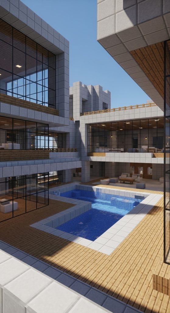 A modern minimalist castle focuses on clean lines and simple geometric shapes. Use smooth stone, concrete, glass, and wood for walls, floors, and roofs. Start with a rectangular or square base and build towers with straight edges. Large windows and open spaces give the castle a sleek, modern appearance. Minimalist castles often feature terraces, gardens, and pools to complement the design.