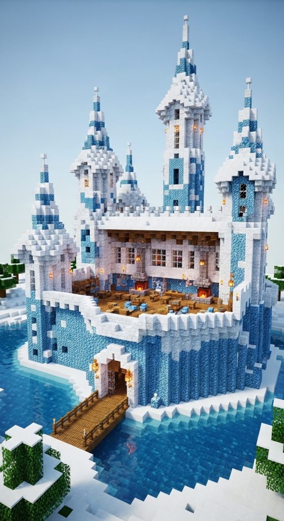 A snowy ice castle fits perfectly in snowy or tundra biomes. Use ice, packed ice, snow blocks, and stone for walls, towers, and floors. Start with a large foundation of snow blocks and outline the walls. Incorporate towers with pointed roofs and build bridges or walls with ice blocks for a frosty appearance. Lighting is important, so use torches or glowstone to prevent mobs from spawning inside.