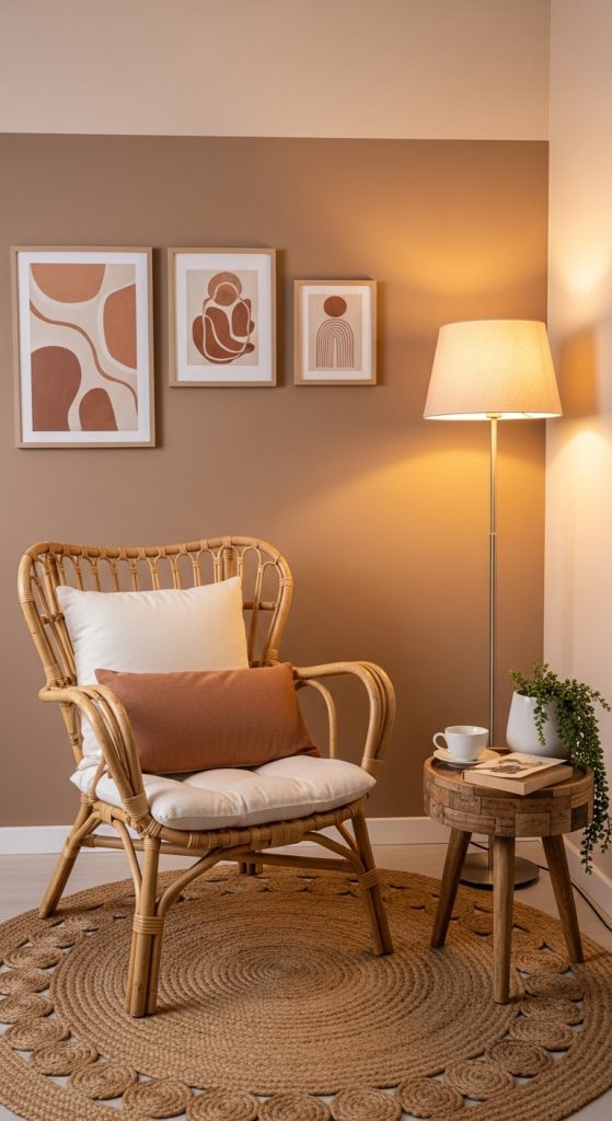 Preparation requires testing mushroom shades on multiple walls due to its shifting undertones under different lighting. Use a primer suited for mid tone neutrals to ensure accurate color payoff. Furnish the space with light wood, wicker, stone elements, and soft textured fabrics. Incorporate natural fiber rugs, linen curtains, and neutral decorative pieces to add depth. This palette excels in creating balanced spaces that feel calm and inviting without becoming bland or overly simple. It is suitable for bedrooms, dining rooms, and reading nooks where comfort and visual harmony are essential. Light mushroom acts as a unifying base, while soft almond brings subtle personality into the room.