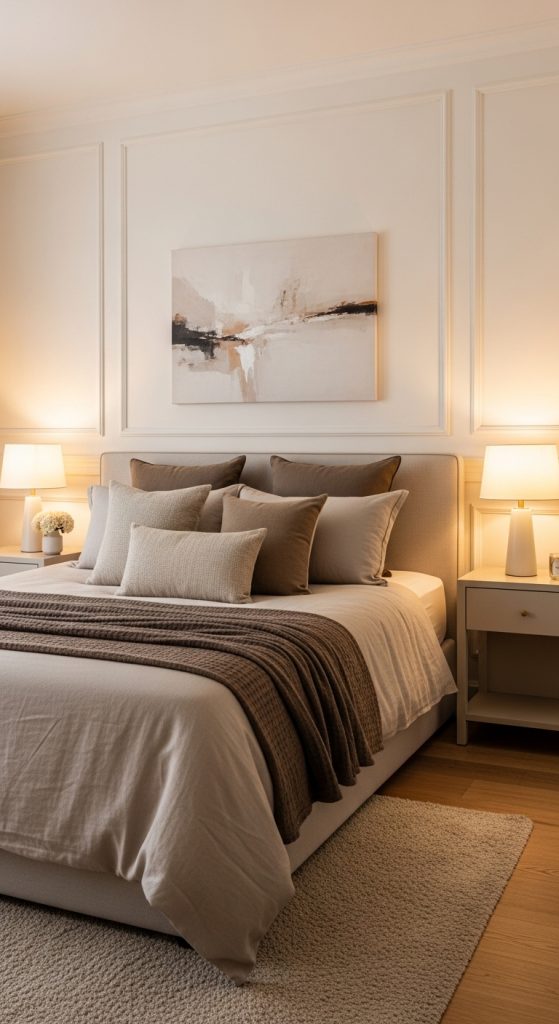 Preparation begins with sanding and smoothing darker surfaces, especially if taupe will be applied, since textured or uneven walls may affect how deeper tones appear. Choose satin or eggshell finishes for taupe to bring gentle reflectiveness. Complement the palette with natural materials like jute, rattan, oak, and cotton fabrics. Artwork featuring earthy landscapes or abstract neutral patterns adds harmony without disrupting the palette. Light sand creates a spacious feeling and balances taupe so that the room does not feel heavy. Lighting with soft gold fixtures enhances the richness of taupe while keeping the space gentle and soothing. This palette is particularly effective in family rooms, bedrooms, and reading corners due to its calming and grounded presence.