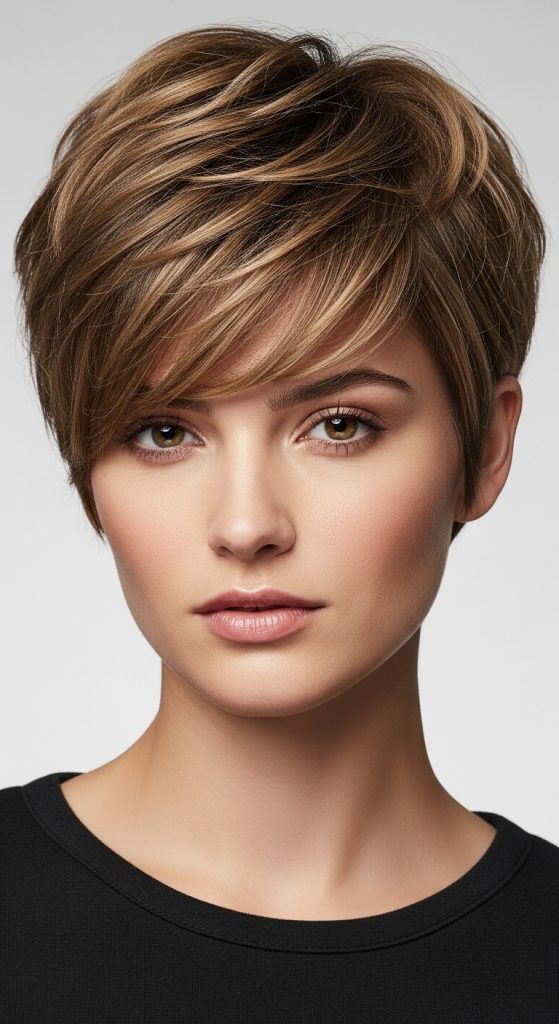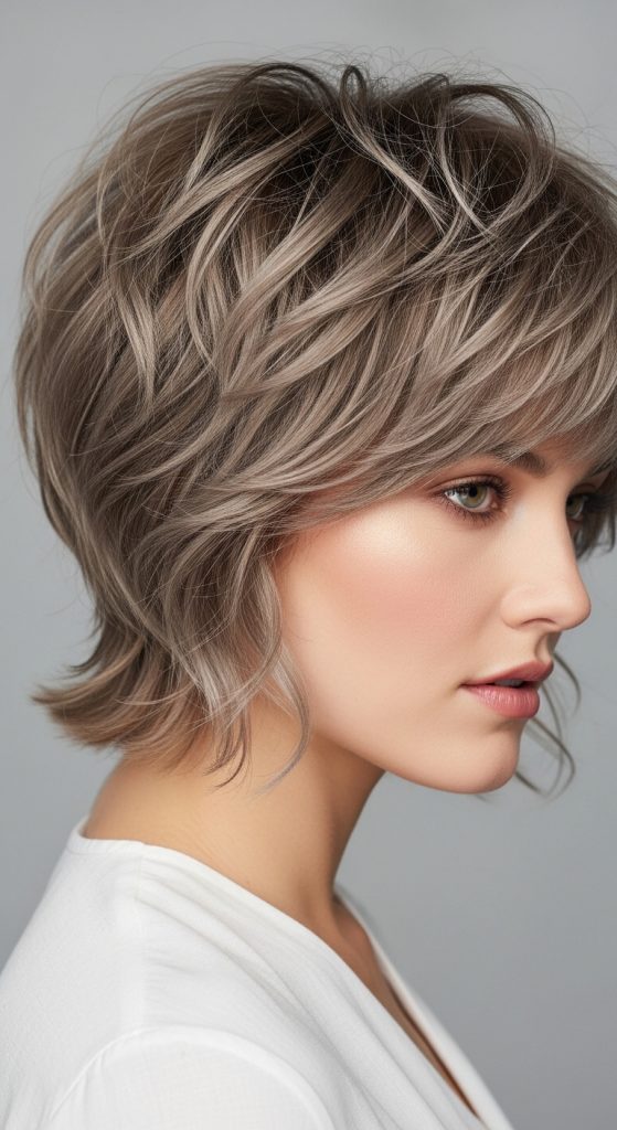 A layered pixie shag emphasizes dimension and movement. Layers can be soft or choppy depending on personal preference. This style is versatile and adds volume to fine hair.