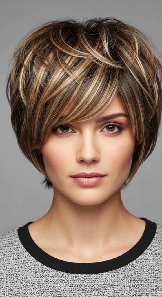 Styling: Blow-dry with a round brush, using fingers to separate layers. Highlights look best with textured or slightly messy styling.