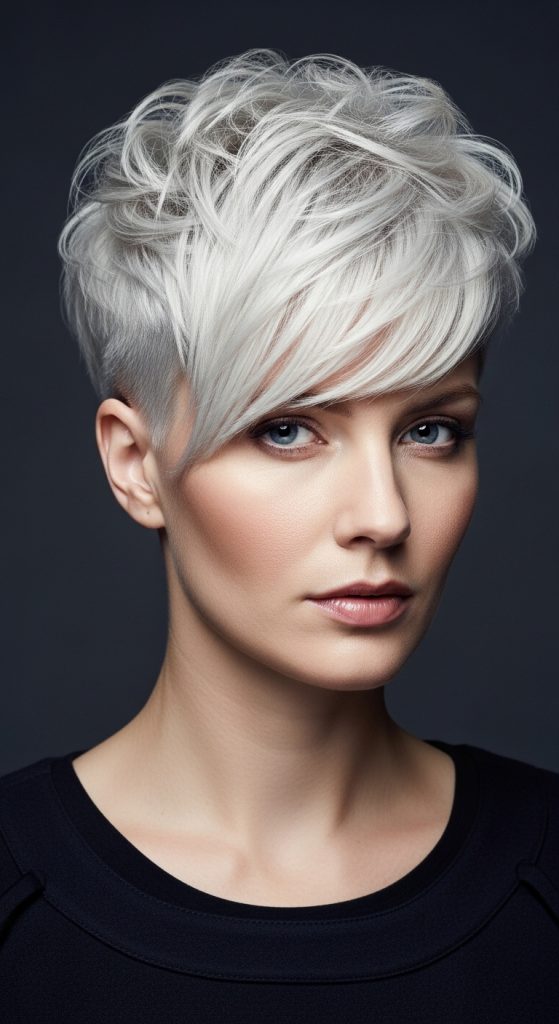 Maintenance: Regular trims every 4-6 weeks maintain clean lines. This look suits professional settings and formal events, combining elegance with the pixie shag’s classic charm.