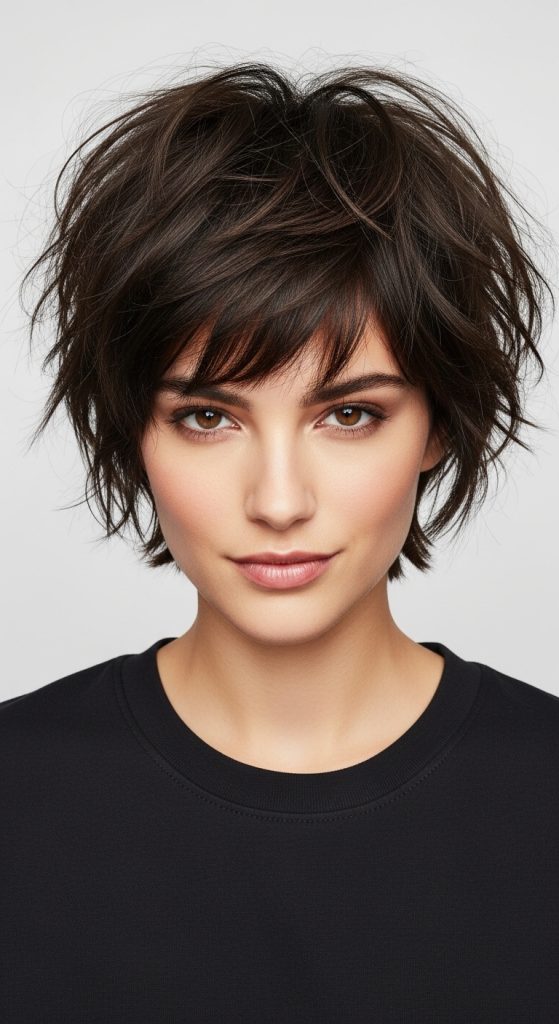 Adding bangs to a pixie shag enhances its youthful, playful look. Textured bangs soften the forehead and add depth to the overall hairstyle.