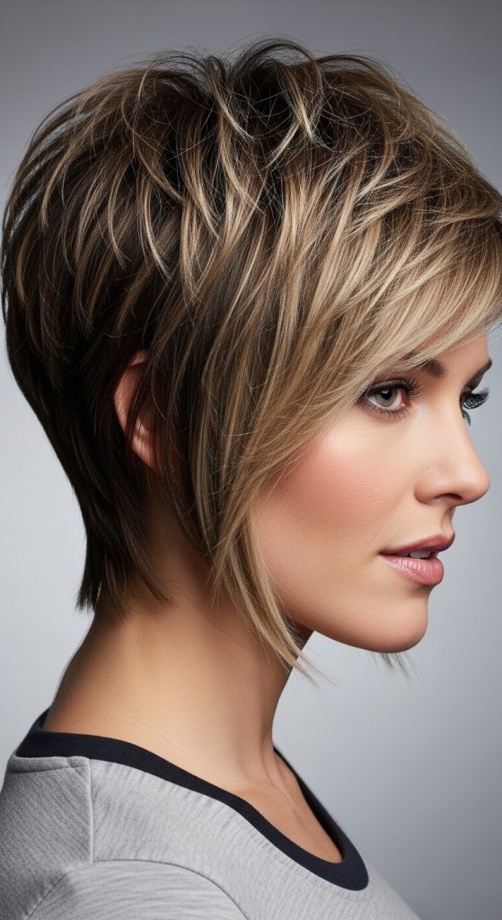 Maintenance: Touch up highlights every 6-8 weeks. Regular trims prevent layers from looking dull and maintain the overall shape of the pixie shag.