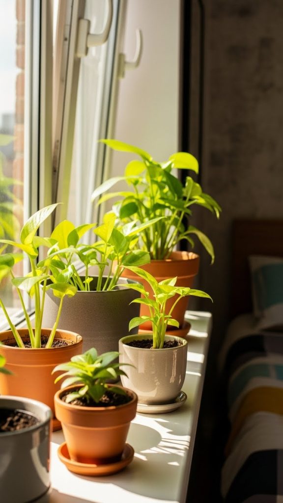 Rotate plants every few weeks to ensure even growth. Wipe leaves to keep them clean. Window sill plants create a fresh view and connect indoor space with the outside environment, making the bedroom feel brighter and more open.