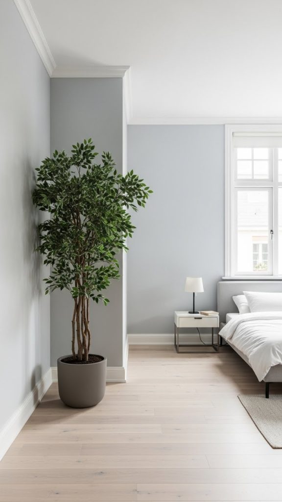 A single plant used as a statement piece fits perfectly in minimalist bedrooms. This approach focuses on quality rather than quantity and keeps the room clean and uncluttered.