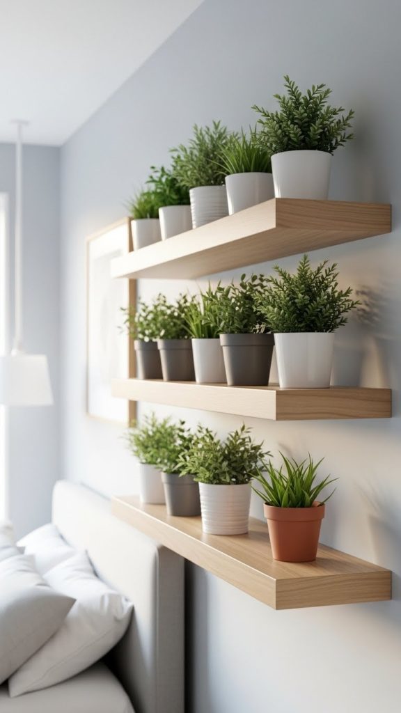 Wall-mounted plant shelves are ideal for bedrooms with limited floor space. They allow you to decorate vertically while keeping the room organized. This method also helps display multiple small plants without clutter.