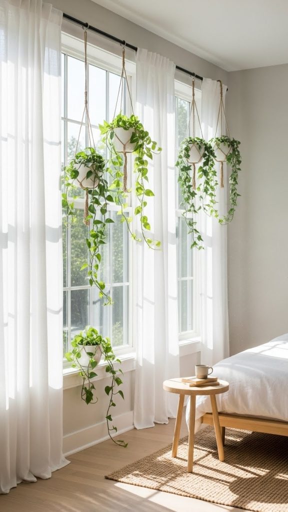 Hanging plants are excellent for bedrooms because they save floor space and add visual interest at eye level. This idea works best near windows where plants can receive indirect sunlight. Hanging plants also soften hard window frames and create a relaxed atmosphere.