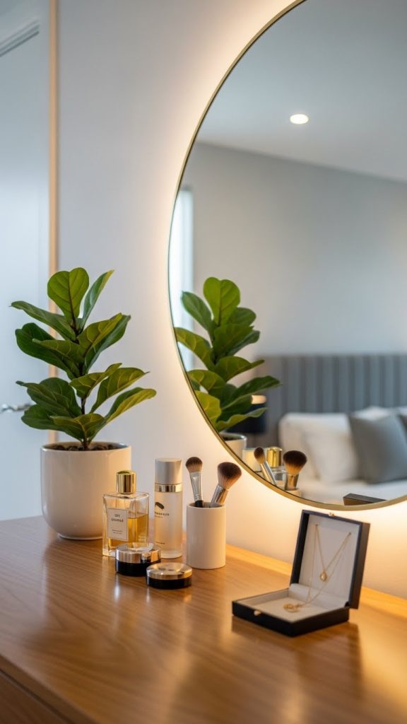Dressing tables can feel dull without decoration. Adding plants helps soften mirrors and creates a balanced, natural look. This idea works well in both modern and traditional bedrooms.