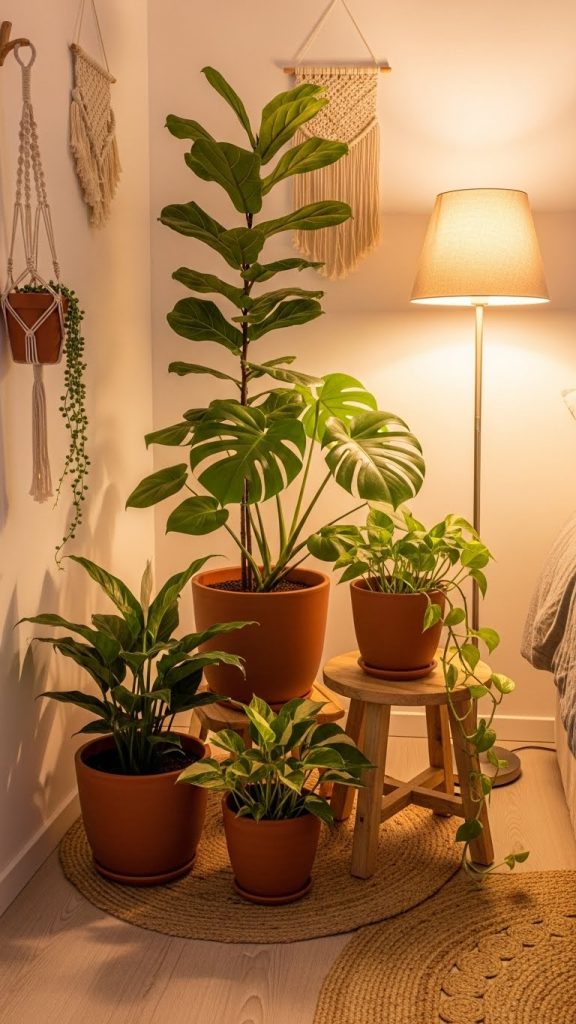Water plants individually based on their needs. Rotate positions occasionally. Grouped plant decoration adds depth and turns the bedroom into a calm, nature-inspired retreat.