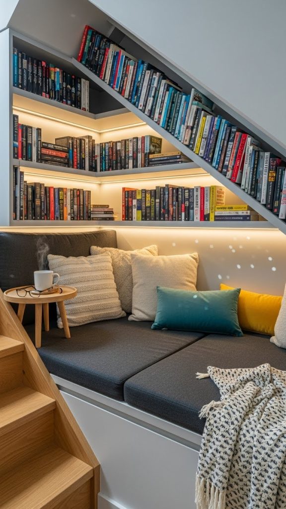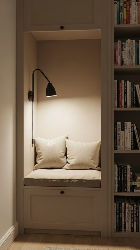 This nook is best for focused reading and studying. The enclosed space reduces noise and distractions. Soft colors and warm lighting make it feel comfortable rather than cramped. This idea is excellent for small apartments and homes where space is limited but creativity is high.