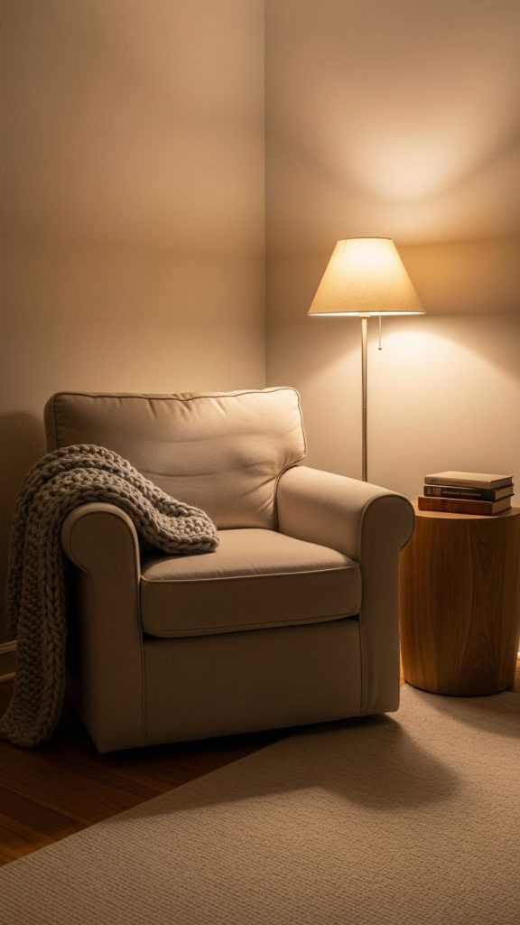 This nook is best used for night reading. A lamp with adjustable brightness is important to reduce eye strain. You can place a small basket for books and journals beside the chair. This reading nook helps separate reading time from sleeping time, which can improve focus and relaxation. It is simple to create and works well even in small bedrooms.