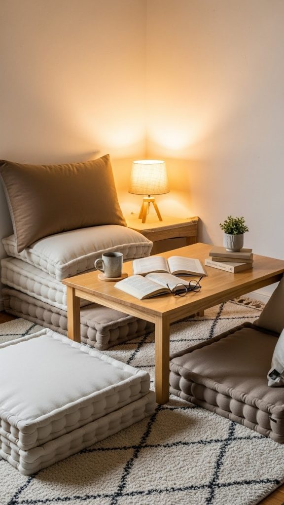 A floor seating reading nook is inspired by minimalist and traditional styles. It is budget-friendly and very flexible.