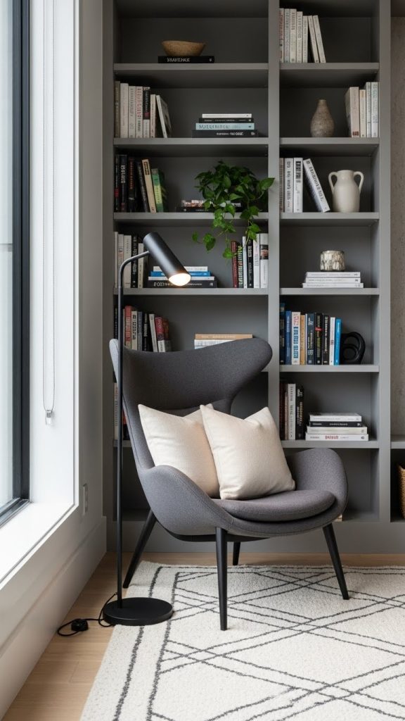 A living room reading nook blends reading space with social space. It is suitable for homes where reading is a shared activity or where space is limited.