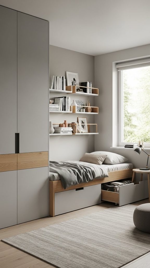 Furniture placement should follow vertical storage principles. Use wall shelves instead of floor cabinets. Choose slim furniture designs with built-in storage. Keep the floor as open as possible to avoid a crowded look. This redesign is suitable for small bedrooms, studio apartments, or guest rooms.