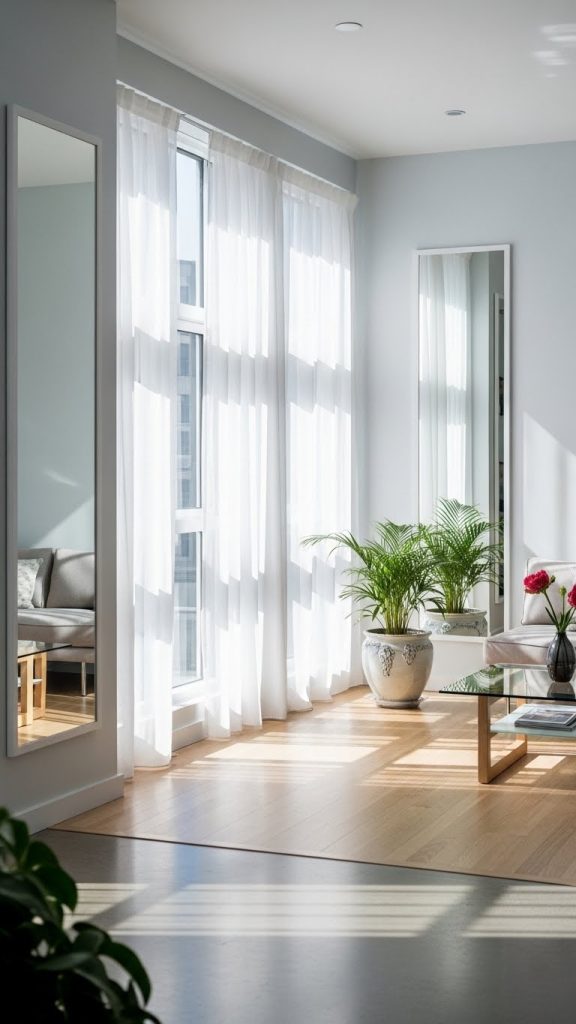 Materials include sheer curtains, mirrors, light-colored wall paint, and reflective furniture surfaces. Use glass or light wood furniture to maintain brightness.