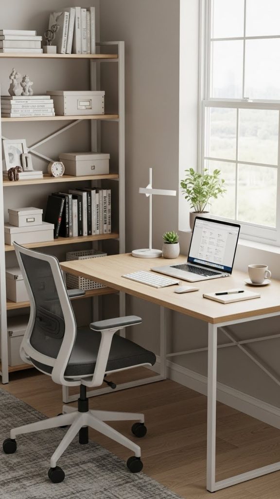 Materials include a sturdy desk, ergonomic chair, storage cabinets, task lighting, and cable management tools. Wall colors like light blue, white, or soft green help maintain focus. Use shelves to organize books and office supplies.