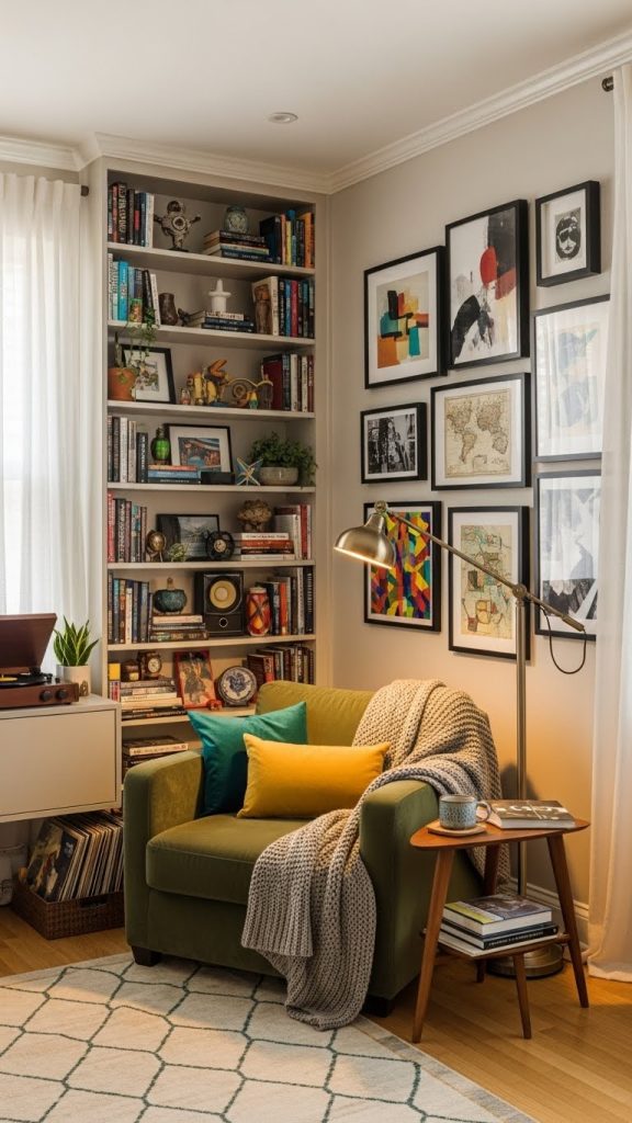 Materials include custom furniture, personal artwork, display shelves, and themed decor. Choose colors and textures that make you feel comfortable and inspired.