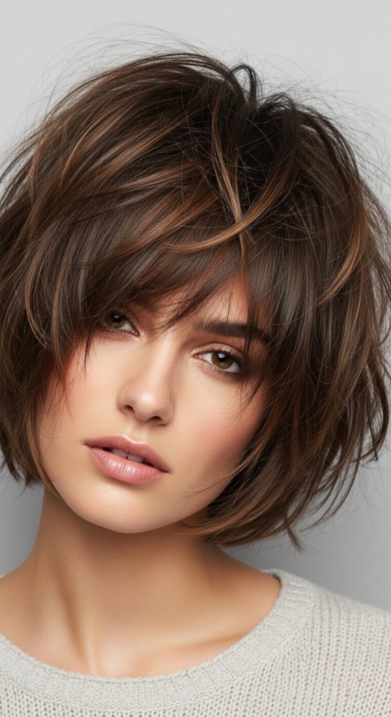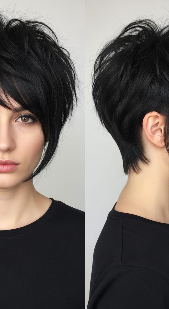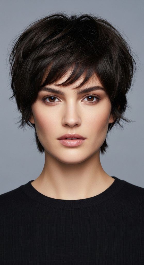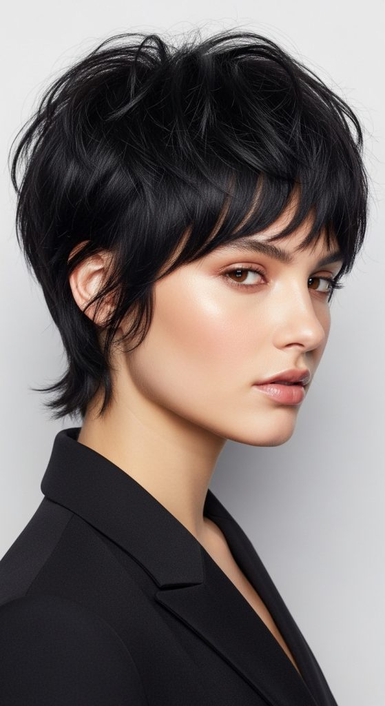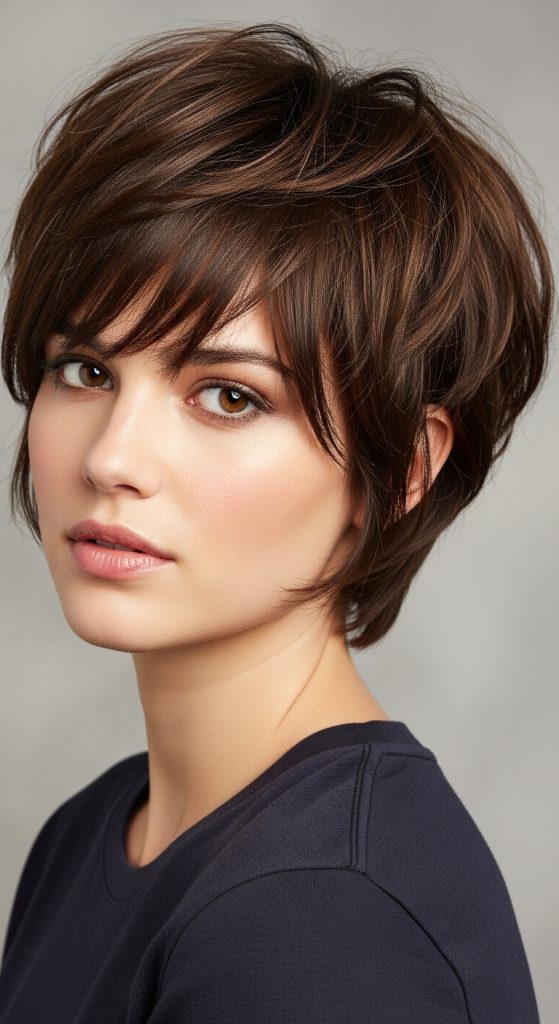 A layered shaggy pixie with side bangs is a soft and flattering variation of the pixie haircut. The addition of side-swept bangs frames the face and makes the hairstyle look more balanced and elegant.