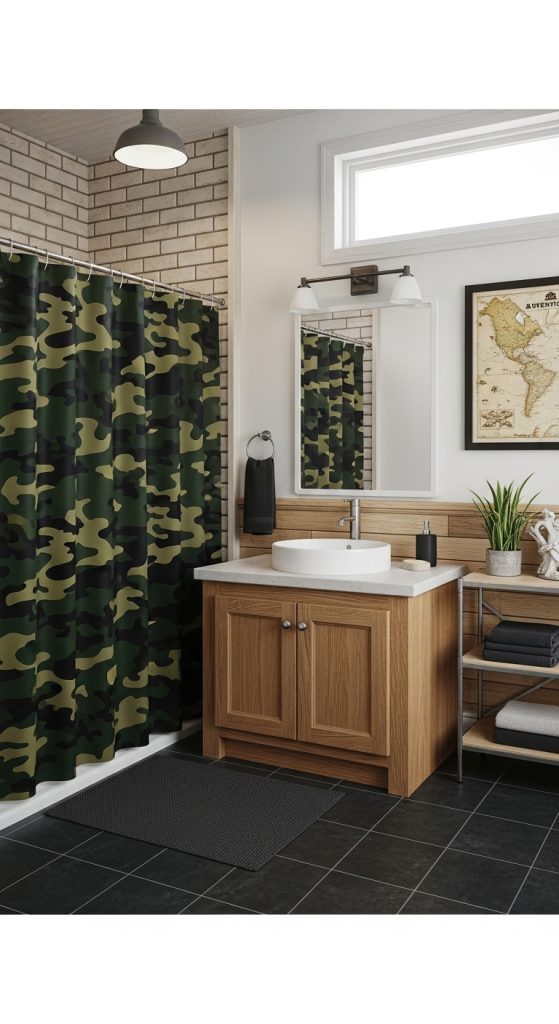 A camouflage shower curtain is a great choice for boys who enjoy outdoor adventures, camping, or military-style designs. Camouflage patterns usually combine green, brown, and black shades.