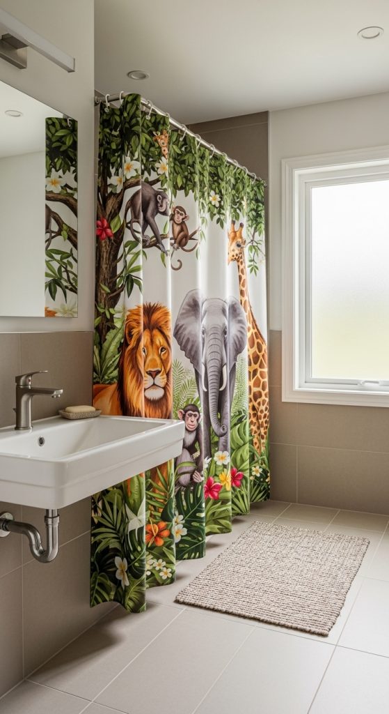 A safari-themed curtain can also encourage children to learn about animals and wildlife. It is a versatile theme that works well in both modern and traditional bathrooms.