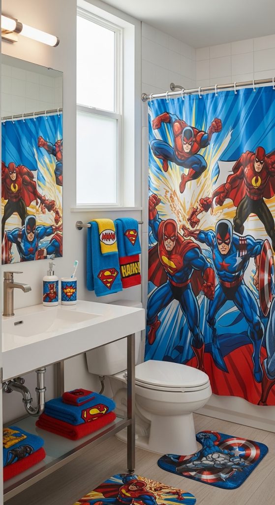 Superhero curtains also pair well with themed bathroom accessories like soap dispensers, wall art, or towels. This creates a coordinated design that makes the bathroom feel like a fun and energetic space.