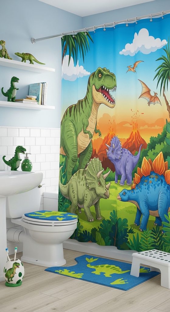 A dinosaur-themed curtain can turn the bathroom into an exciting prehistoric adventure space for kids.
