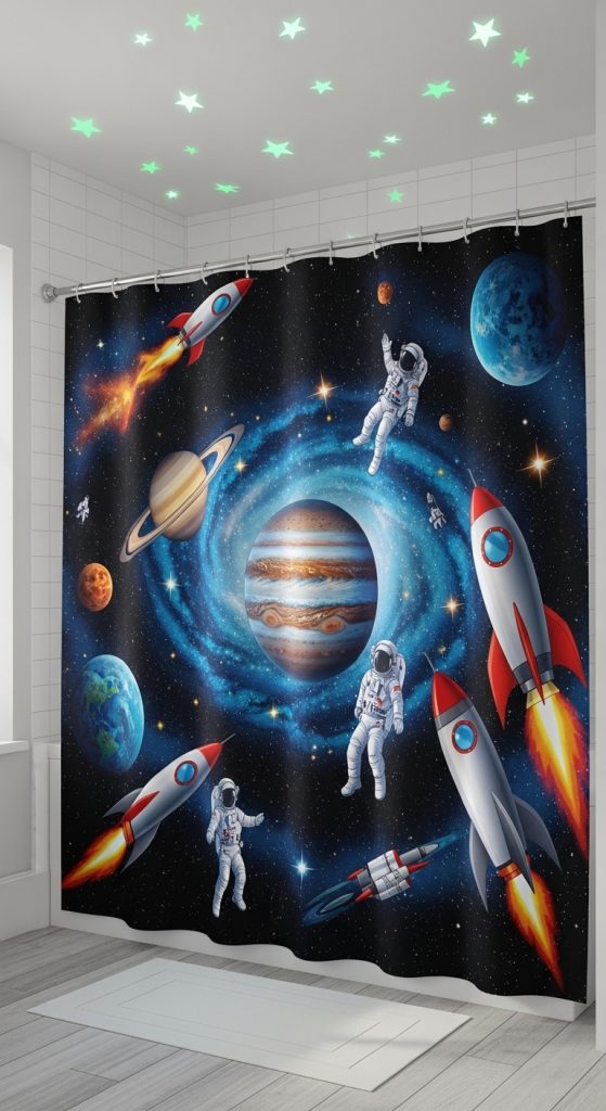 This theme works well in modern bathrooms and can inspire curiosity about science and astronomy. It also pairs nicely with glow-in-the-dark stars or space-themed wall decorations.