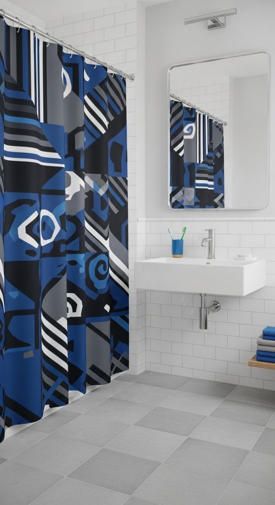 A geometric shower curtain is a versatile option that works well as boys grow older, making it a long-lasting design choice for the bathroom.
