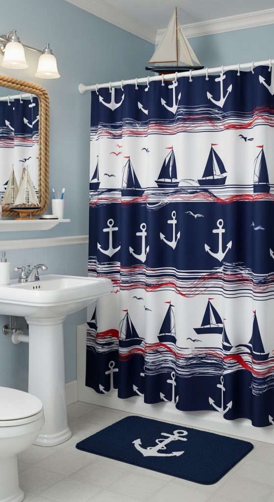 A nautical theme is a classic design choice for boys’ bathrooms. Curtains often feature anchors, ships, waves, or sailor-style stripes.