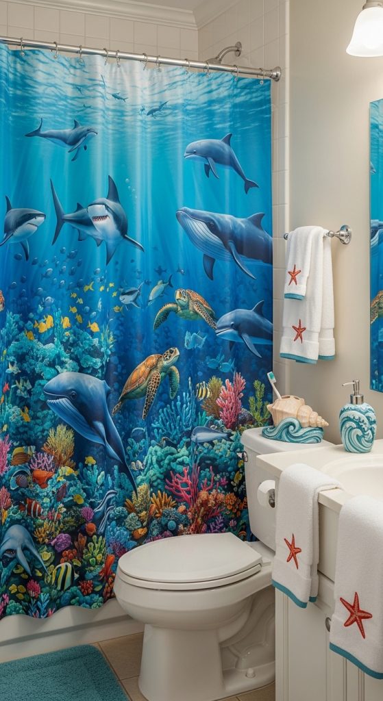 An ocean-themed shower curtain helps create a calming environment while also making bath time more enjoyable for children.