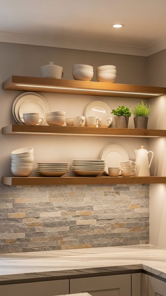 4. Natural Stone Backsplash with Wooden Open Shelves