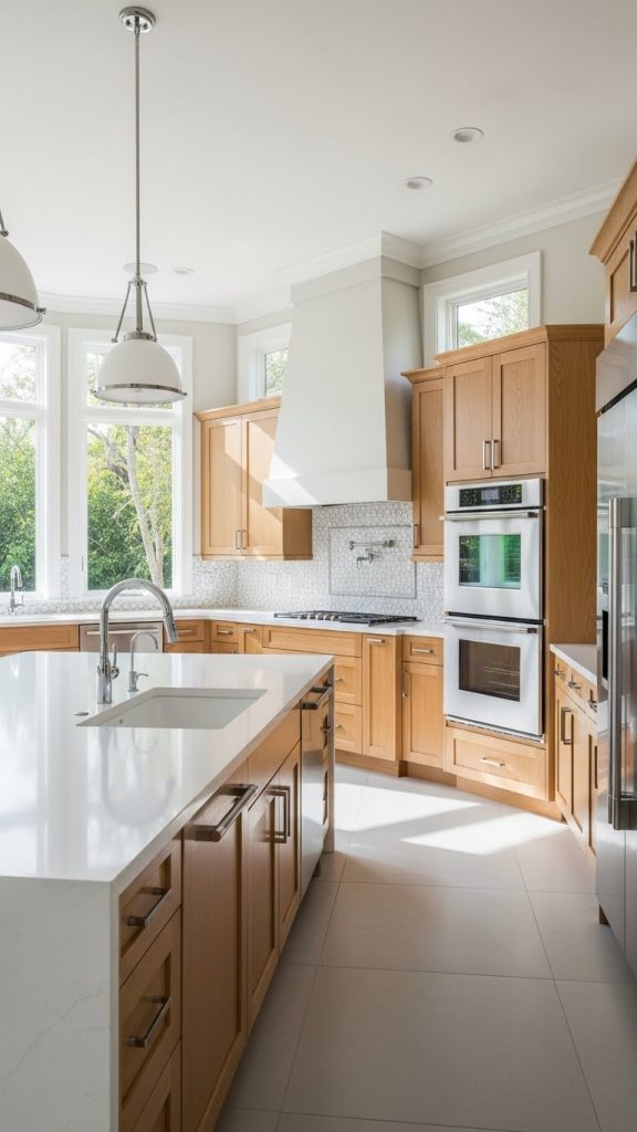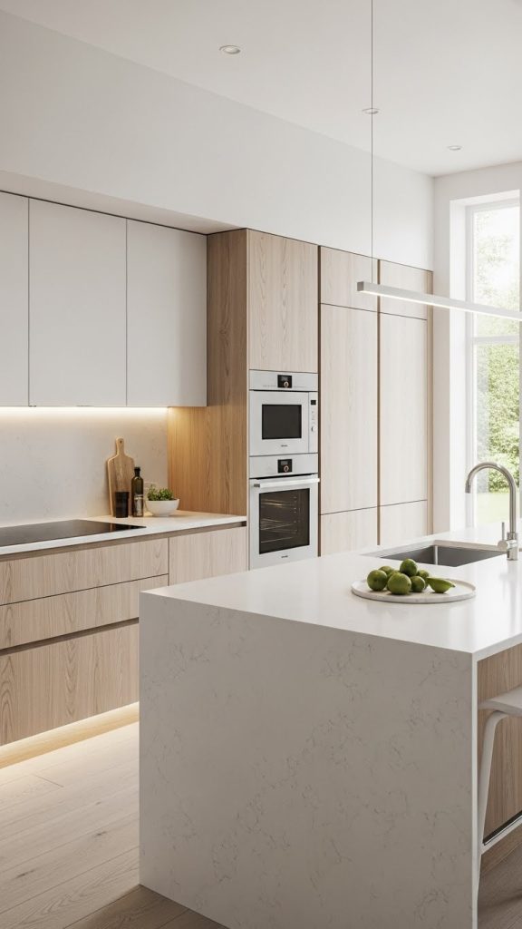Light wood combined with white or light-colored stone creates a bright and airy kitchen. Materials such as white quartz countertops and pale oak cabinets are commonly used.