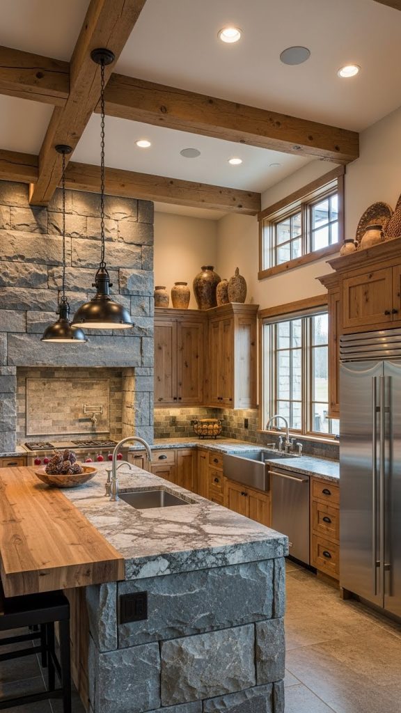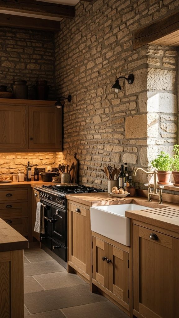 1. Rustic Stone Walls with Solid Wood Cabinets