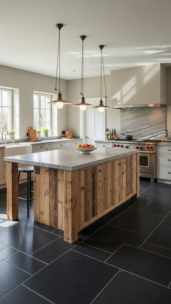 Using stone flooring and a wooden kitchen island creates a strong base with a warm center. Stone floors such as slate, granite tiles, or travertine are durable and easy to clean. They handle heavy foot traffic and kitchen spills well.