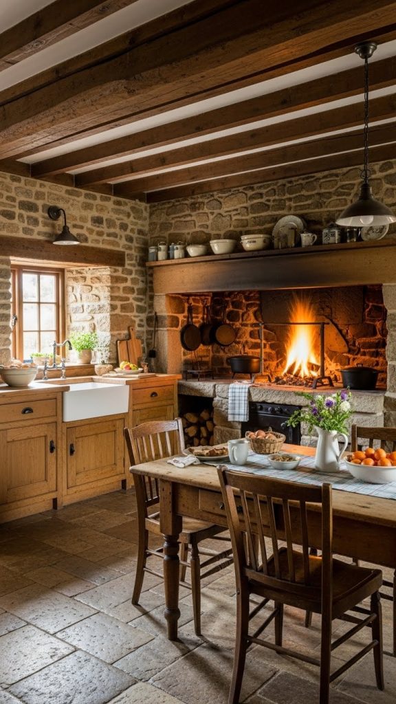 10. Traditional Stone Hearth Kitchen with Wooden Beams