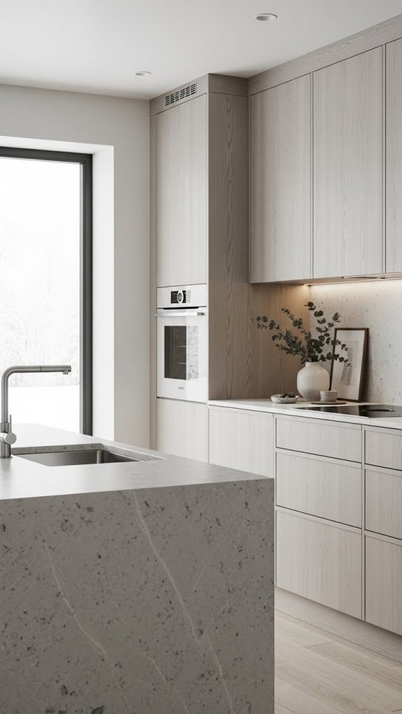 2. Modern Stone Countertops with Minimal Wood Cabinetry
